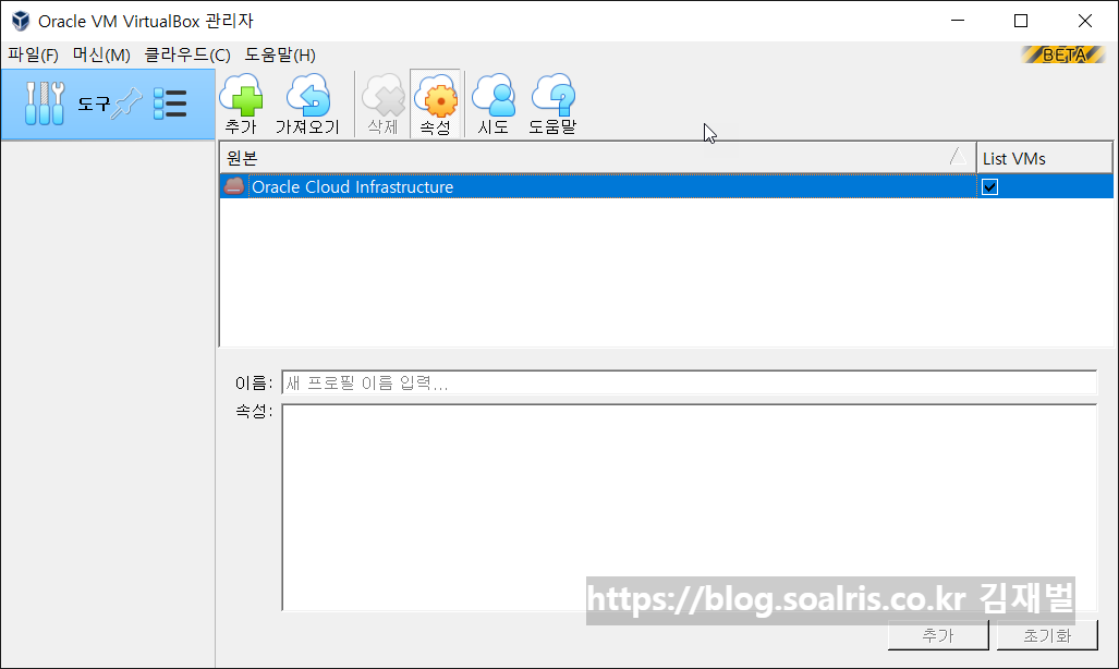 설치 한 뒤에 버추얼박스 관리자에 진입합니다. 우측에 베타 관련 알림을 확인 할 수 있습니다.
