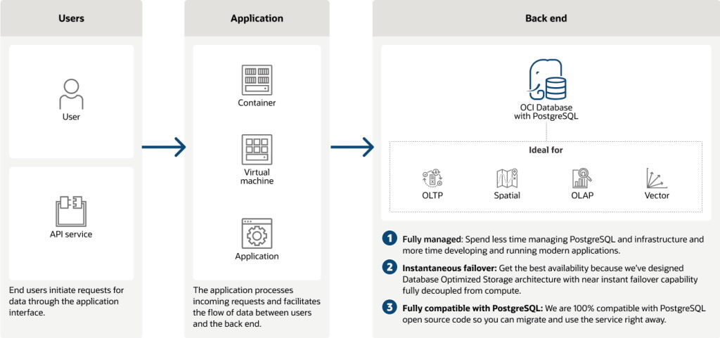 이는 완전한 PostgreSQL 호환성을 제공하는 동시에 사용자가 내장된 보안과 간단한 가격으로 OCI의 유연한 고성능, 고가용성 인프라를 활용할 수 있도록 해줍니다.