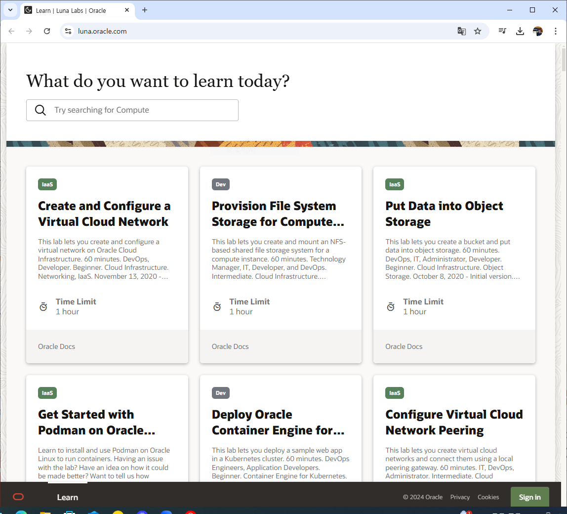오라클에서 제공하는 다양한 학습 콘텐츠와 환경들이 있는데, 2023년에 제공되던 가상 교육 환경이 이름이 변경되어 Luna Lab 이라는 이름으로 제공되고 있네요.